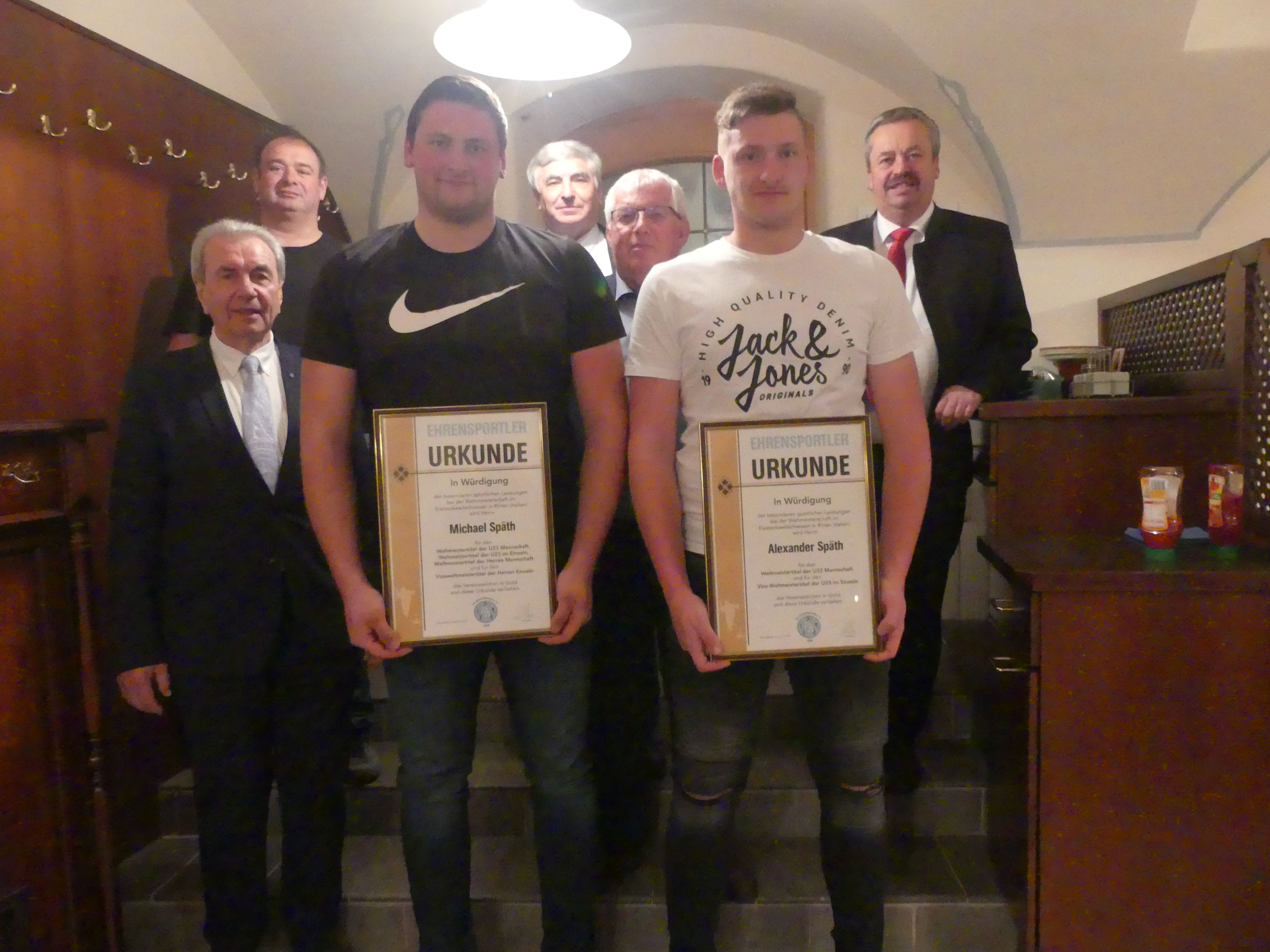 Peter Maier eröffnete den Abend und begrüßte die Gäste, besonders die beiden Weltmeister, die Brüder Michael und Alexander Späth und deren Mutter Regina. Anschließend ergriff Karl Holmeier, MdB a.D das Wort, gratulierte herzlich zu den Erfolgen und stellte erfreut fest, dass Michael und Alexander Späth eines der sportlichen Aushängeschilde des Landkreises seien. Günther Lommer, der Sportreferent des Kreistages, verlas nun ein Schreiben von Landrat Löffler: "Es ist eine der schönsten Aufgaben eines Landrates, erfolgreiche Sportler aus dem Landkreis ehren zu dürfen! Bei der 7. Eisstock-Weltmeisterschaft Weitensport "Junioren U23" in der Eis-Arena Ritten/ Italien holten in einem packenden, erstklassischen Weitensport-Finale Michael Späth den Weltmeistertitel und sein Bruder Alexander die Vize-Weltmeisterschaft. In der Teamwertung "Junioren 23" holten beide die Goldmedaille - dieWeltmeisterschaft. Michael Späth wurde zusätzlich in der "